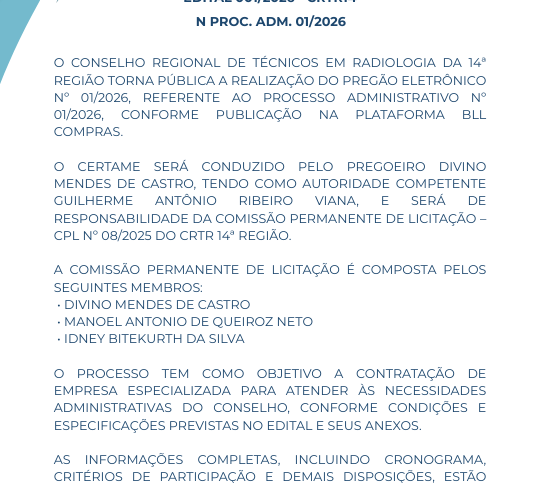 Pregão Eletrônico 001/2026 – CRTR 14ª Região Pregão Eletrônico nº 001/2026 Processo Administrativo nº 01/2026 • CRTR 14ª Região O Conselho Regional de Técnicos em Radiologia da 14ª Região torna pública a realização do Pregão Eletrônico nº 001/2026, referente ao…