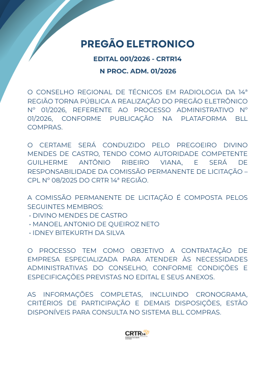 O Conselho Regional de Técnicos em Radiologia da 14ª Região torna pública a realização do Pregão Eletrônico nº 001/2026, referente ao Processo Administrativo nº 01/2026, conforme publicação na plataforma BLL Compras.